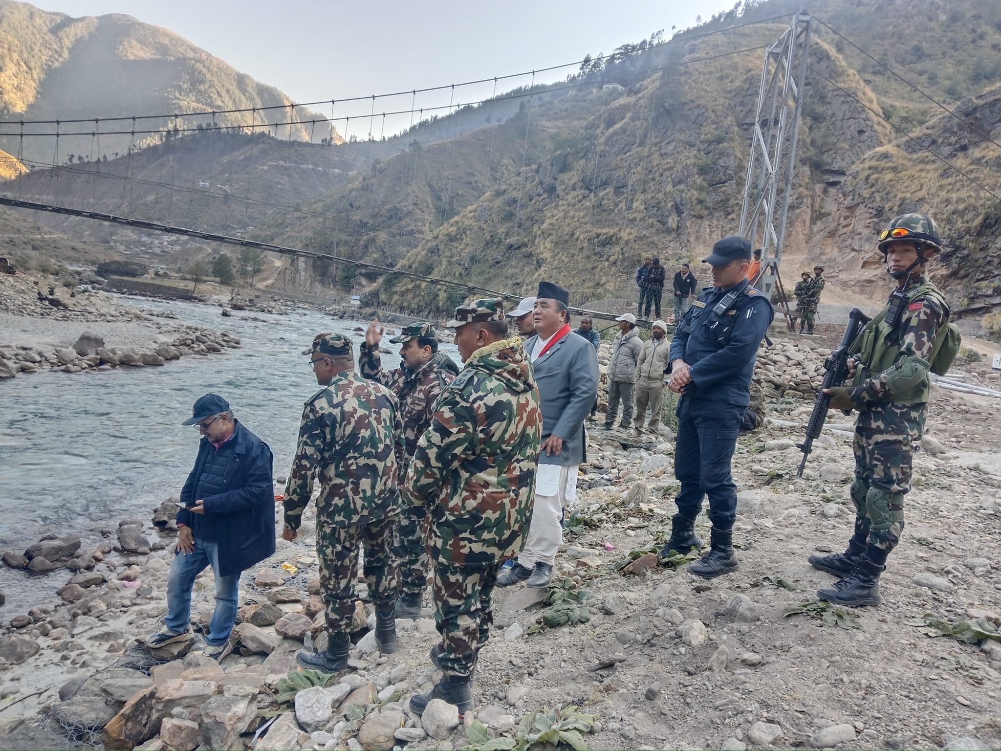 सिमकोट । संघीय सरकारका भौतिक पुर्वाधार तथा यातायात मन्त्री देबेन्द्र्र दाहाल र रक्षा मन्त्री मानविर राईको टोलीले खार्पु कर्णाली करिडोरको हुम्ला जिल्लामा पर्ने खार्पुनाथ गाउँपालिका– ५ को खार्पुमा रहेको दोजाम कर्णाली नदीसम्म अनुगमनमा आएका छन् । बेलिब्रीज बन्ने अवस्थाको बारेमा जानकारी लिन मन्त्रद्धयको टोली सो स्थानमा आई पुगेको हो ।दोजाम कर्णाली नदी किनारमा मन्त्री दाहालले तीन महिना भित्र बेलिब्रीज निर्माण कार्य गर्न सडक बिभागलाई निर्देशन दिएका छन् । कर्णाली करिडोरको स्थलगत अनुगमन गर्न आउने क्रममा खार्पुमा पुगेका मन्त्री दाहालले सो कुरा मन्त्रालयको सचिब सहितको टोलीलाई सो निर्देशन दिएका हुन ।