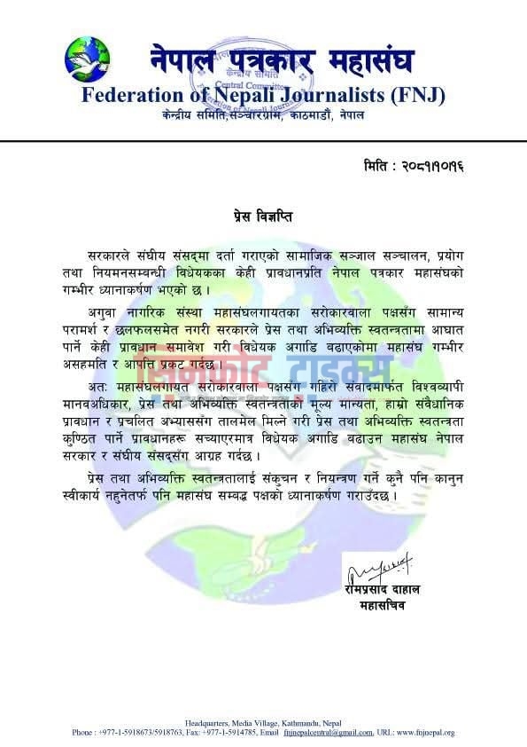 गरेको छ । सामाजिक सञ्जालको नियमन गर्ने नाममा विश्वव्यापी मानवअधिकार, प्रेस तथा अभिव्यक्ति स्वतन्त्रताको मूल्य मान्यता, हाम्रो संवैधानिक प्रावधान र प्रचलित अभ्याससँग तालमेल मिल्ने गरी प्रेस तथा अभिव्यक्ति स्वतन्त्रता कुण्ठित नपार्ने गरी विधेयक अघि बढाउनुपर्ने माग महासंघको छ । महासंघले विधेयकका प्रावधान सच्याउन संघीय संसदसँग आग्रह पनि गरेको छ।