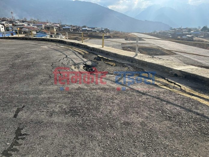 सिमकोट बिमानस्थलको नयाँ निर्माण गरिएको एप्रोन ( ट्याक्सी वे ) भाँसिएको छ । एप्रोनका लागि पुरिएको माटोमा गतिलो किसिमले रोलर नलाए कै कारण माटो तल झर्दा कालो पत्र गरेको एप्रोनको भाग भाँसिएको हो ।