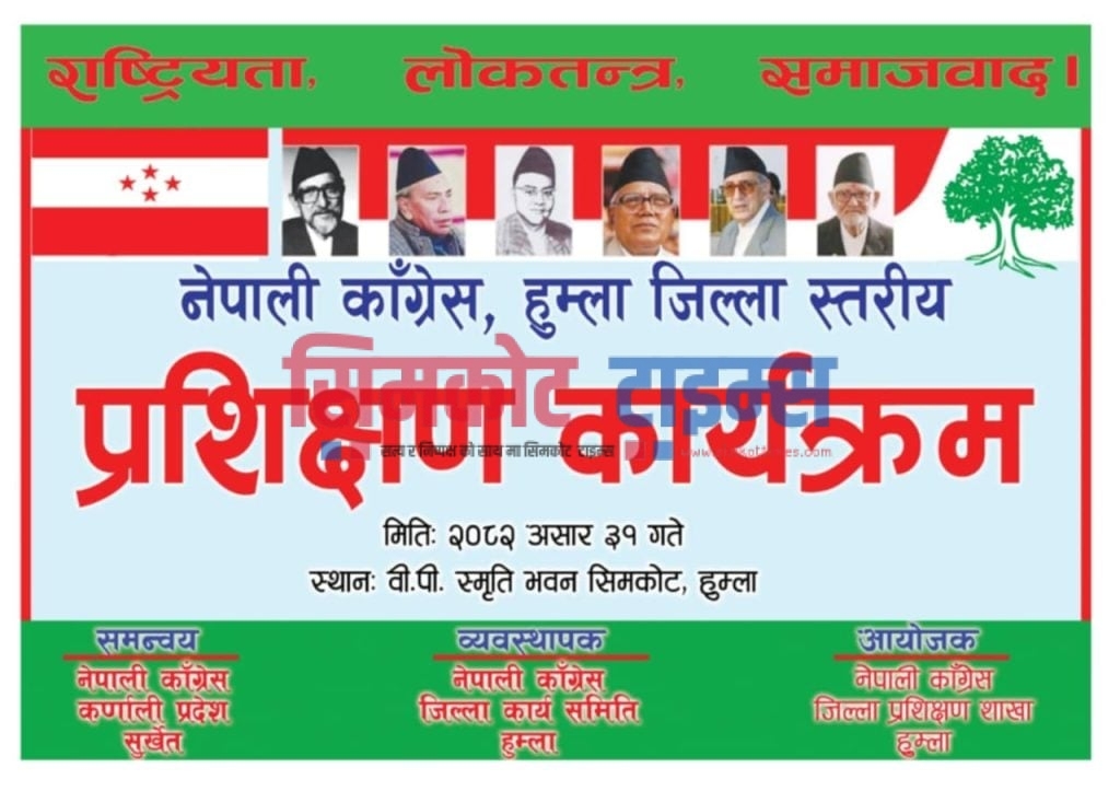 एक दिने प्रशिक्षण कार्यक्रम असार ३१ गते अथाएत आज मंगलबार बिहान ११ वजे विपी स्मृति भवनमा सञ्चालन हुदै छ । सदरमुकाम सिमकोटमा सञ्चालन हुनेछ । यो कार्यक्रमका लागि नेपाली काग्रेस कर्णाली प्रदेश कार्य समितिका उपसभापति सनत कार्कीको उसोमबार हुम्ला आई सकेका छन