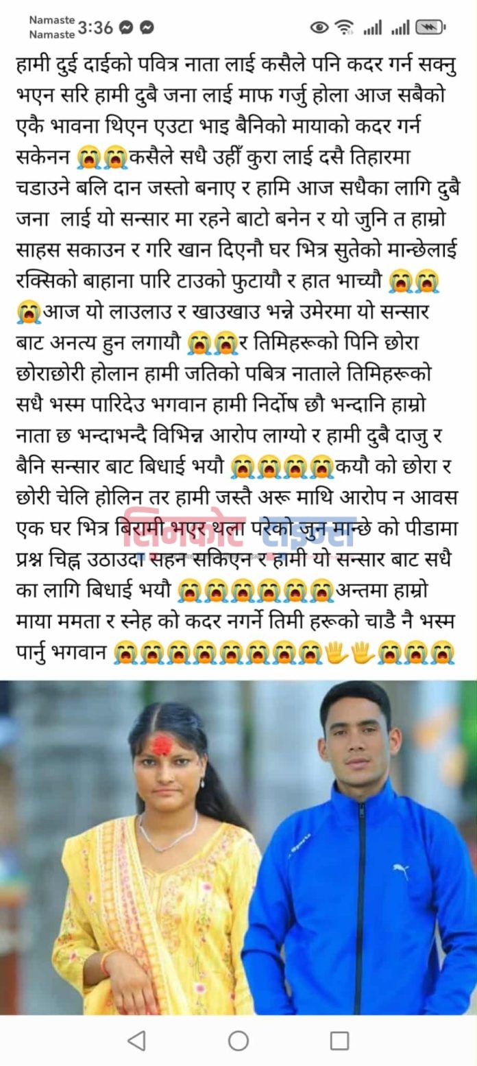 यसरी कर्णाली नदीमा हाम फाल्नेमा चङ्खेली गाउँपालिका–४ को सलीसल्लाको कर्णाली नदीमा फाम फाल्नेमा सोही वडाको माथिल्लो पालीका बिबाहित हंस बुढाथोकी र सोही वडाकी वर्ष १९ की अबिबाहित कर्मा बोहराले संगै हाम फालेका हुन । दुवै जनाबिच प्रेम सम्वन्ध रहेको स्थानीयले आरोप लगाउदै आएका थिए ।