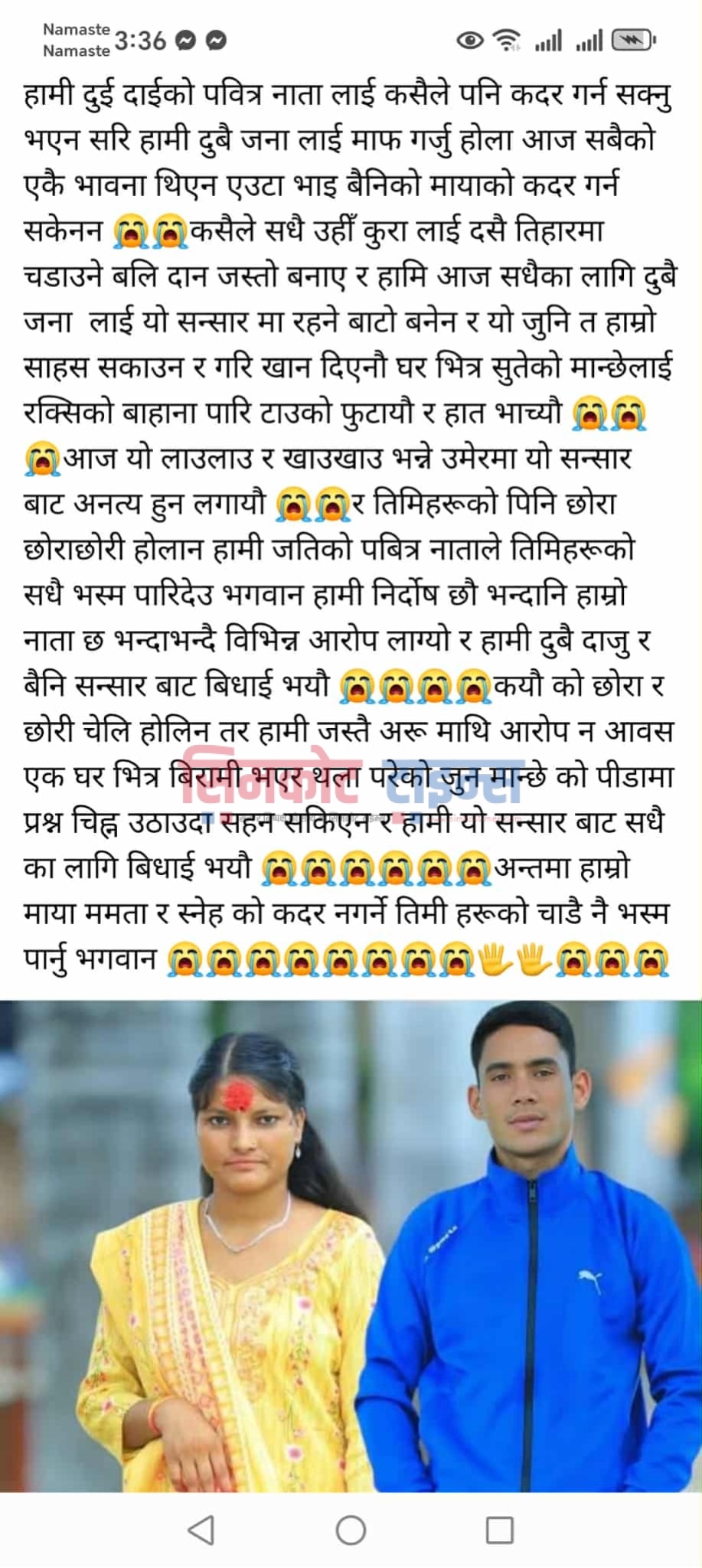 दुबै जनाले संगै हाम फालेको सलीसल्लामा गाई पाल्दै आएका सैलेन्द्र शाहीले प्रहरीलाई जानकारी गराएका थिए । शाहीले गाईलाई घास हाल्ने क्रममा हाम फालेको देखेको प्रहरीलाई जानकारी गराएका थिए । नदीमा हाम फालेका दुवै जना हालसम्म बेपत्ता रहेका छन् ।